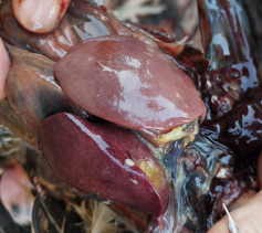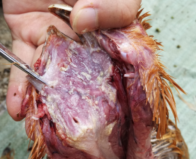 股骨頭壞死,股骨頭軟骨容易脫落;嗉囊白色假膜樣粘附物、潰瘍;腺胃腫大,壁變厚,腺胃乳頭腫脹、潰瘍,有的乳頭融合、界限不清;肌胃角質層增厚、易裂開脫落,甚至出現明顯潰瘍灶;肺充血、出血,肺等器官可見霉菌結節;肝腫大、質脆變性;胸腺萎縮;雞掉毛或出現皮膚壞死。
