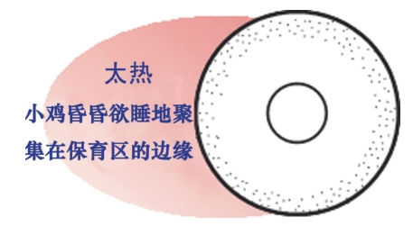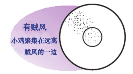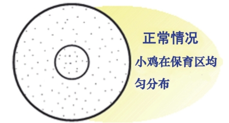 (3)雞舍內的溫度要保持均衡和穩(wěn)定,避免溫度忽高忽低和雞舍兩端溫差過大,檢查溫度是否合適的最佳方法,是觀察雞苗的分布狀態(tài)及活動表現(xiàn)(如下圖,中間小圓圈為加熱器)。
